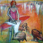 Der Terroranschlag am 11. September gab mir den Anstoß, mich mit dem Leiden unschuldiger Menschen zu beschäftigen. Die zugängliche öffentliche Weltmeinung wurde mit bewusst fingierten Informationen manipuliert: es wurde die "Achse des Bösen" definiert. Das Mädchen oder die Kinder zwischen Trümmern werden zum Leiden verurteilt - der "große Bruder" verschlingt seine ehemaligen Handlanger. Saturn frisst seine Kinder, nach Goya. Mein bisher letztes Bild dieser Serie soll trotz Allem einen optimistischen Akzent setzten und den Betrachterblick auf Positives lenken.